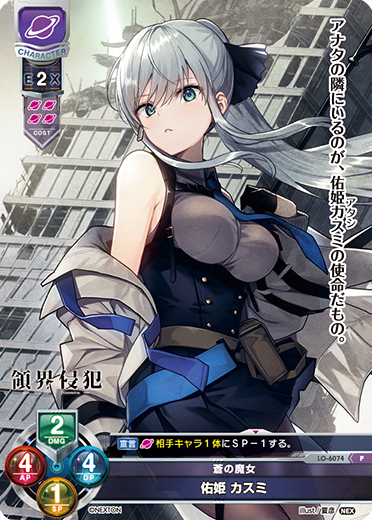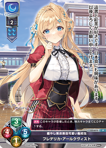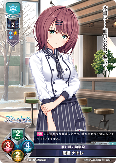 [宣言][T]:己方回合中使用.这个角色卡1枚充能可能.的时候,这个角色卡的充能3枚以下的场合,抽1张牌.[宣言][0]:这个角色卡的充能3枚以上的场合,这个角色卡AP+2・DP+2.[宣言][雪雪雪雪]:己方回合中使用.战斗中不能使用.这个角色卡DF角色卡的场合,这个角色卡放到卡组的下面く.那么做的话,{对手角色卡1体}放到卡组的下面く.己方「第七共和国警察庁」配置的场合,抽1张牌可能.